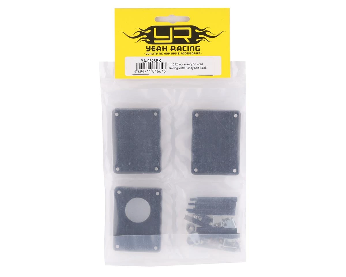 The Yeah Racing 1/10 3 Tiered Metal Rolling Shop Cart Kit is a must have option for any scale garage or even truck bed. Made from metal, this cart features swiveling rollers to aid in movement. Three tiers of trays are used so you can add optional accessories to the trays to add more detail. Package includes one unassembled scale shop cart.