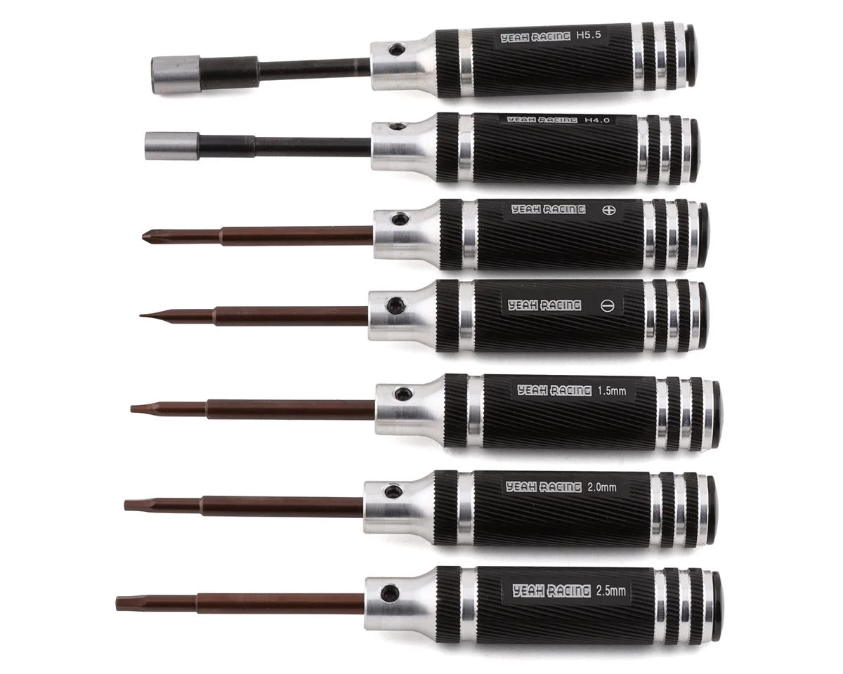 Yeah Racing Aluminum Mini Wrench Tool Set with Tool Bag. These hex wrenches are a great addition to your pit bag/toolbox. Featuring a comfortable machined grip with a stylish finish.