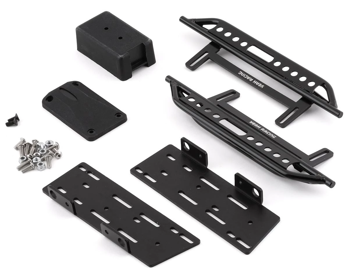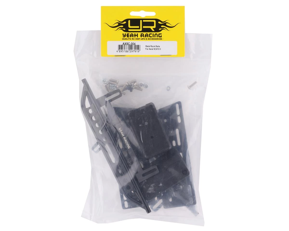 Yeah Racing Axial SCX10 II Steel Rock Sliders with Receiver Box. This optional slider set is great for protecting your body against rocks on the trail. Included is also a receiver box to help keep dust and debris away from your receiver. Package includes two rock sliders, one receiver box and hardware.