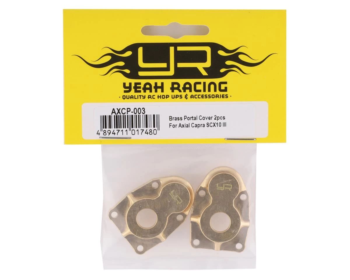 Yeah Racing Axial SCX10 III/Capra Brass Portal Covers. These optional portal covers are great for adding weight to the Axial SCX10 III or the Capra 1.9. Package includes two brass portal covers.
