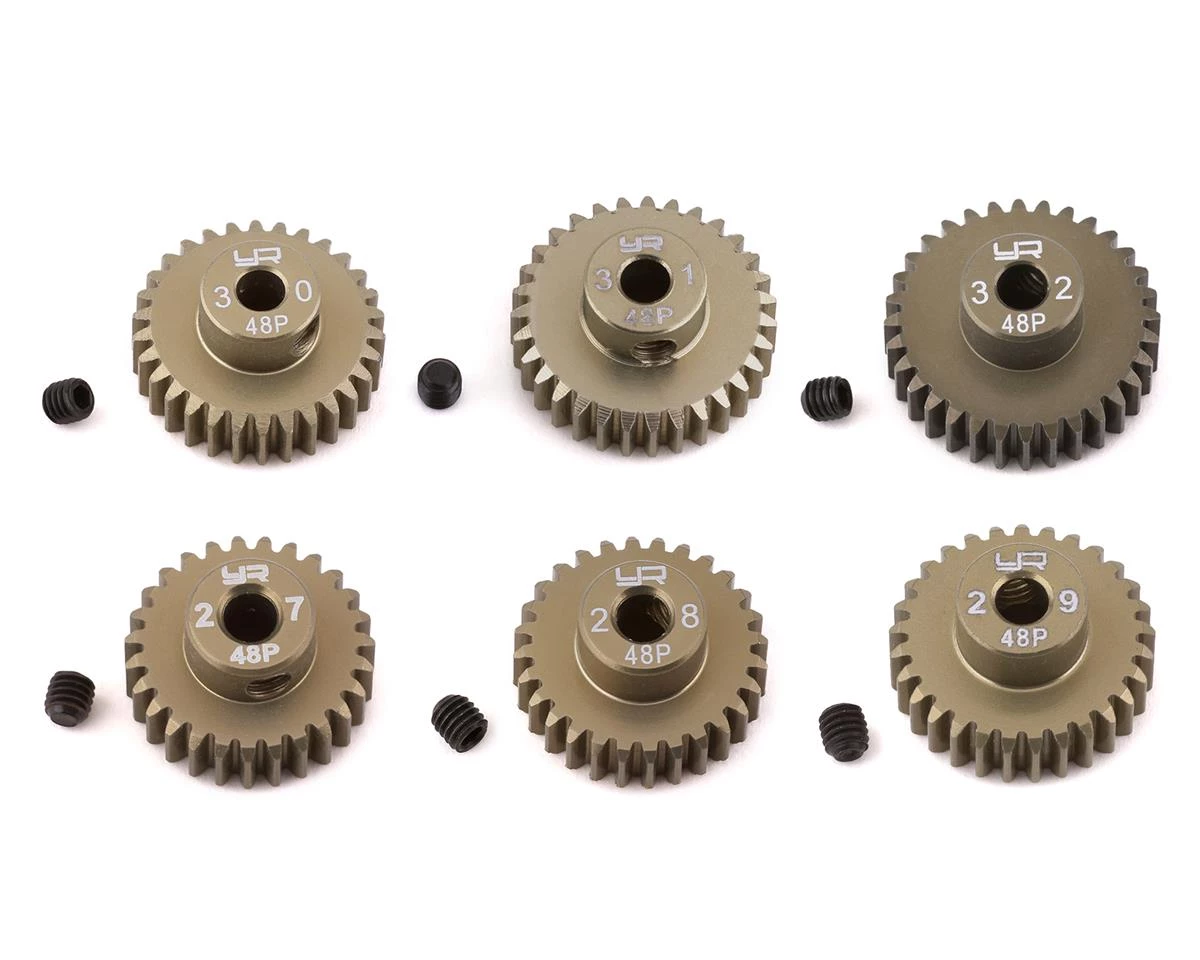 The Yeah Racing Hard Coated 48P Aluminum Pinion Gear Set is a great option for fine tuning your 1/10 chassis. These pinions are titanium coated 7075 aluminum. This allows for a super smooth pinion for better drivetrain efficiency.