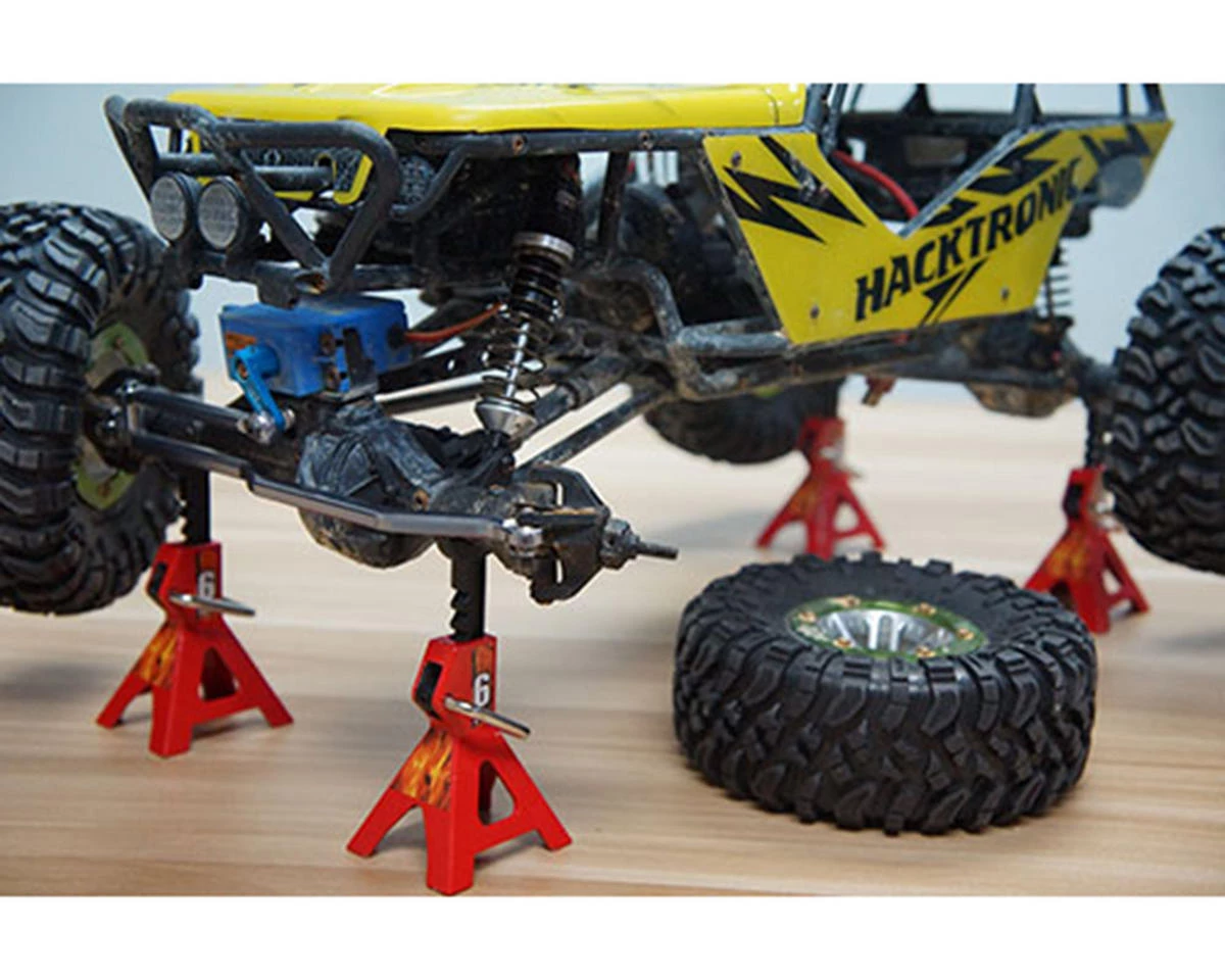This two pack of Yeah Racing 1/10 Height Adjustable 6 Ton Jacks feature realistic looks and functions similar to the real thing. The jacks can support and hold most cars and trucks safely off the ground, prefect for RC repair work or storage. The metal construction and scale size of the jacks make them easily portable and super tough, making them the perfect addition to your RC garage or auto shop.
