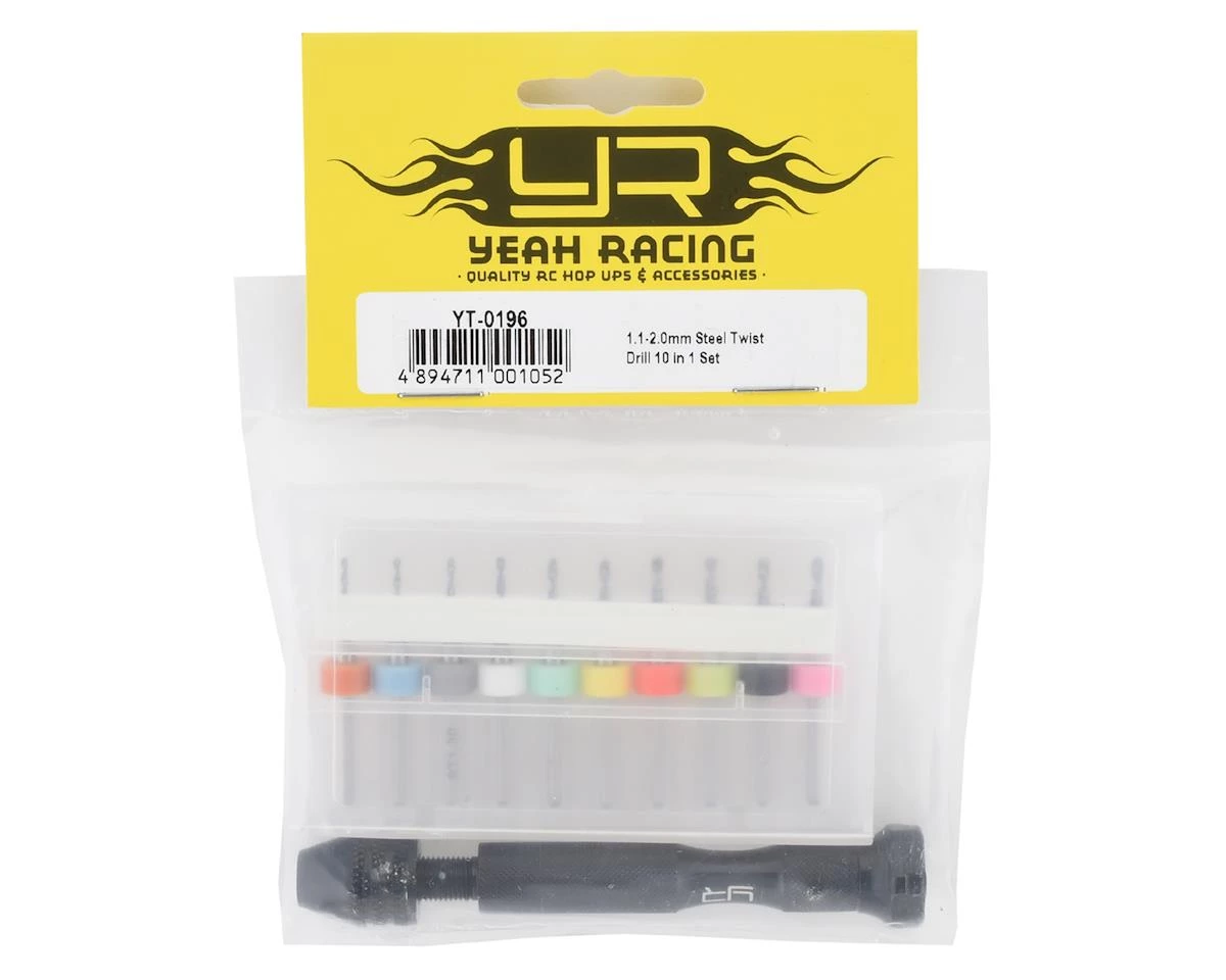 This is a Yeah Racing Steel Twist Drill Set, a precision hand drill set-up with ten bits, a black anodized aluminum hand drill and a convenient carrying case. The steel bit have been color coded to speed up repair time and keep organized. This set includes ten pieces, increasing in 0.1mm increments ranging from 1.1 to 2mm.