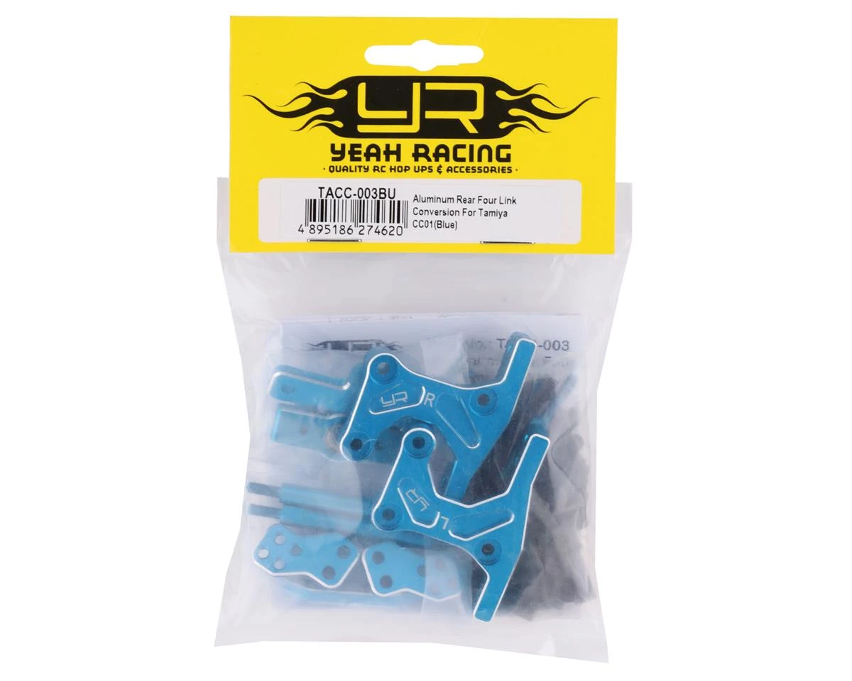 Yeah Racing Tamiya CC-01 Aluminum Rear Four Link Conversion Kit. This optional four link kit is great increasing the flex characteristics of the Tamiya CC-01. Using this will also allow the user to select between 242 and 252mm wheelbase options. Package includes one complete four-link conversion kit.
