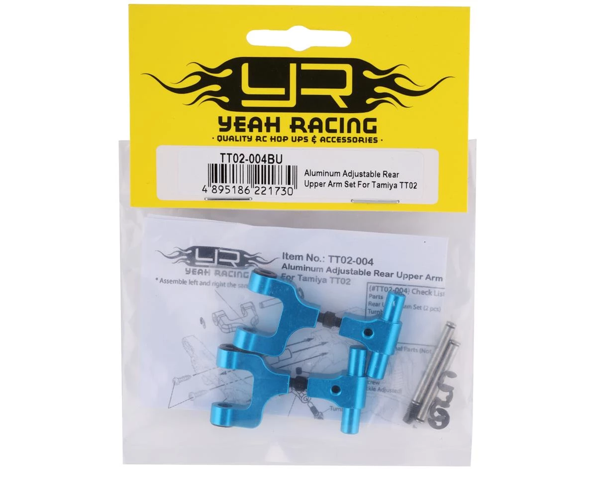 The Yeah Racing Tamiya TT-02 Aluminum Rear Upper Suspension Arms is of the best option parts available for the Tamiya TT-02. Using these will allow for camber adjustment to achieve maximum tire contact during cornering. Package includes two rear upper suspension arms, two suspension pins, four E-clips and hardware.
