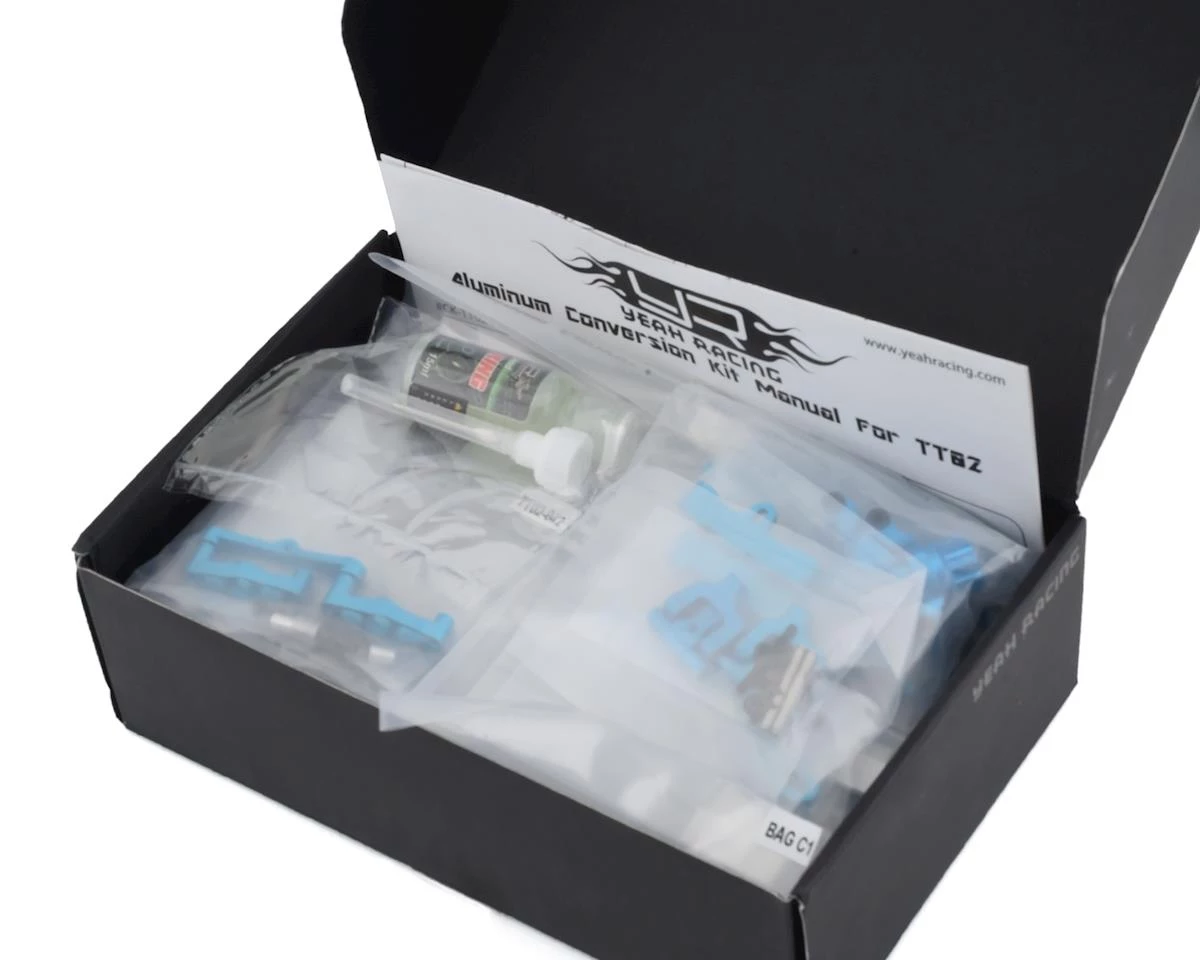 The Yeah Racing Tamiya TT-02 Aluminum Conversion Kit includes everything you need to unleash the full potential of your TT-02 based chassis! Premium quality material, combined with precise CNC machine work creates astonishing performance and improved durability thanks to minimum friction and flex between moving parts and joints. A Premium grade of bearings is also included to replace all the plastic bearings on the stock TT-02 for exceptional driving smoothness and power efficiency.