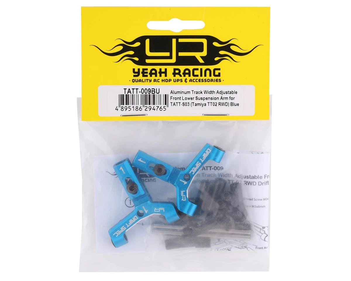 Yeah Racing Tamiya TT-02 RWD Aluminum Adjustable Lower Front Suspension Arms. These optional suspension arms are intended for the lower front of the Tamiya TT-02 when converting to RWD for drift. Using these will allow for an adjustable track width giving you more tuning advantages. Package includes two lower front suspension arms, two suspension arm pins and hardware.