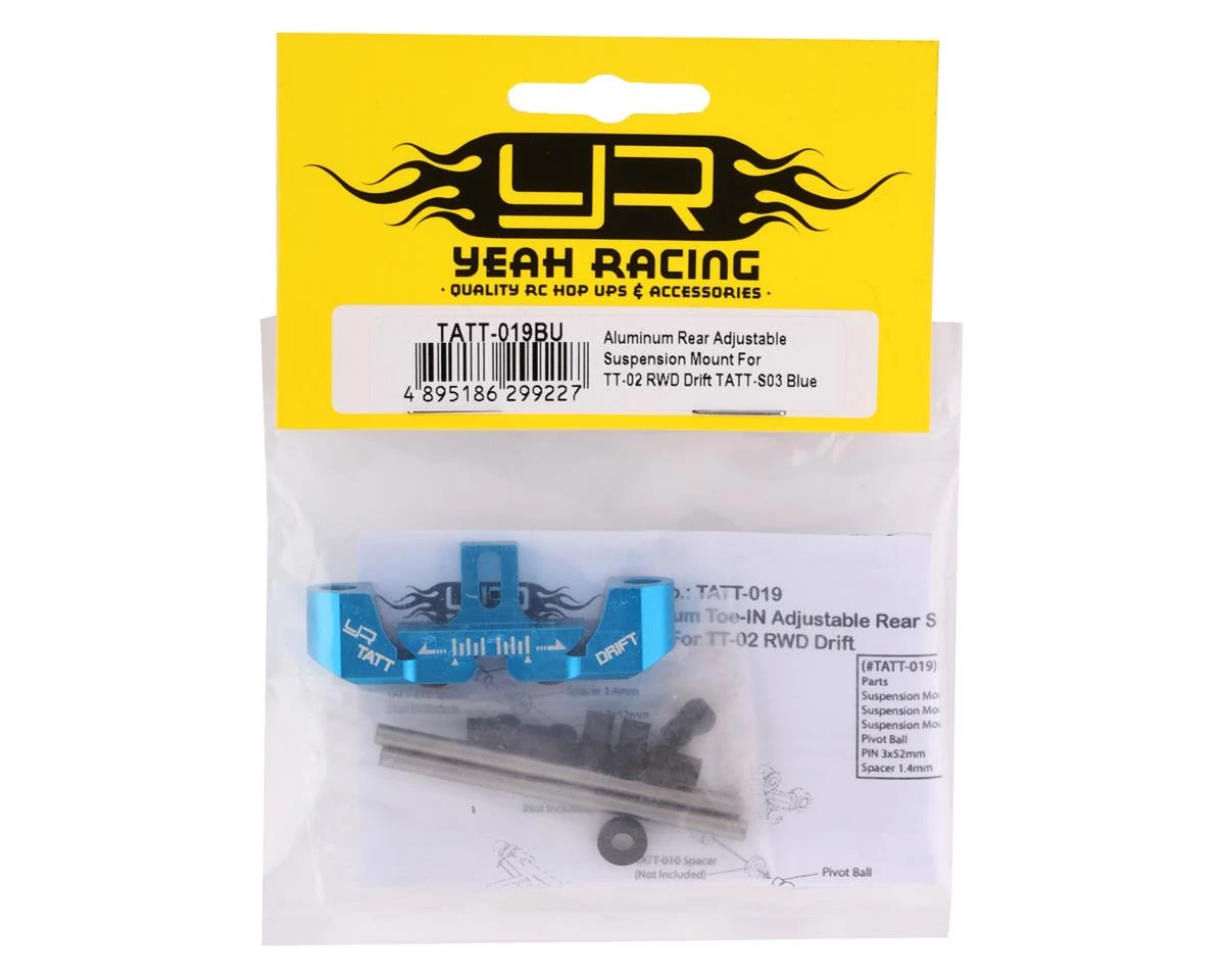 Yeah Racing Tamiya TT-02 RWD Adjustable Aluminum Rear Lower Suspension Arm Mount. This optional mount features different positions to allow for rear toe adjustments if 1, 3.5 or 5° of toe. Package includes one adjustable mount assembly, two suspension pins and hardware.