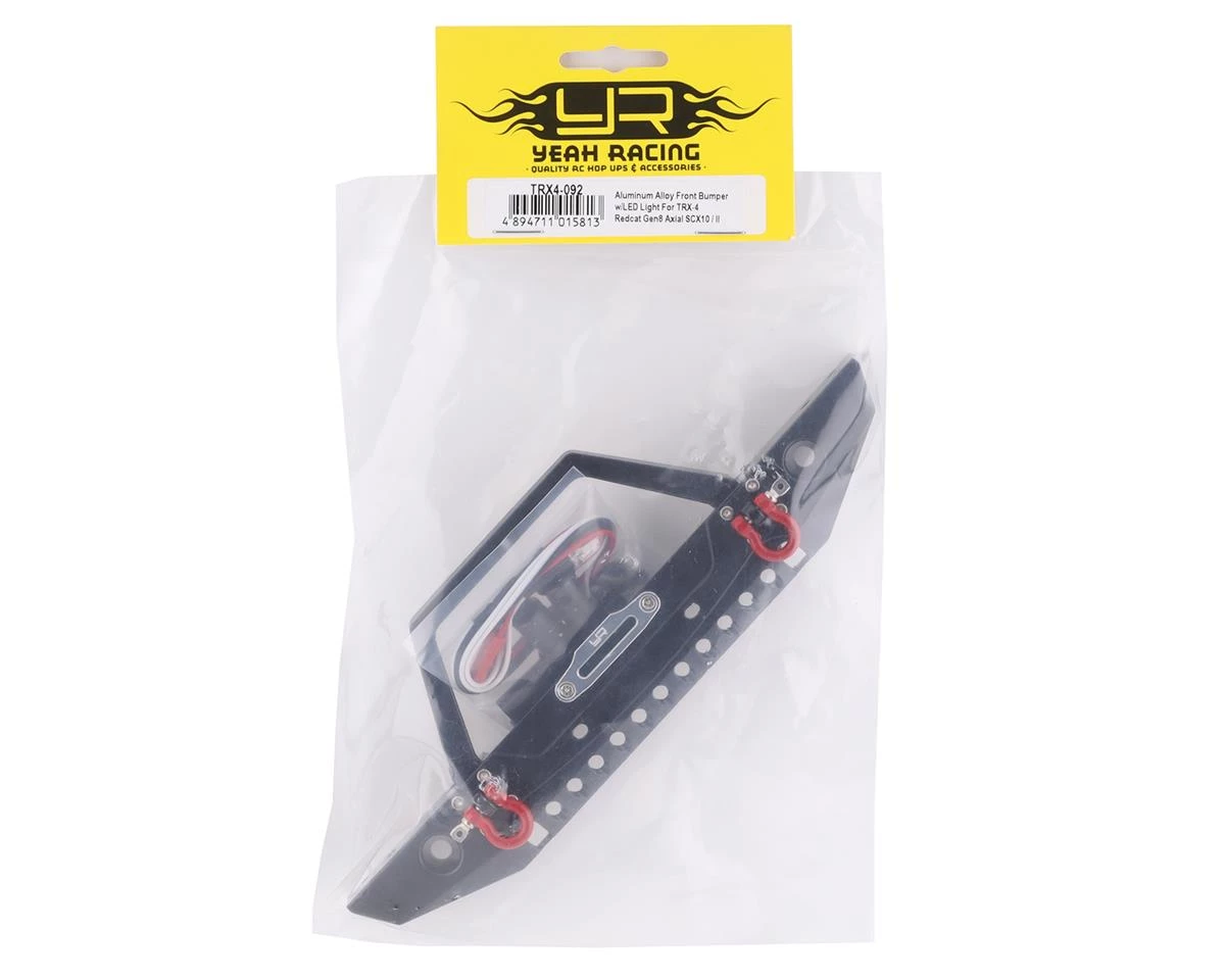 Yeah Racing Traxxas TRX-4/Axial SCX10 II Aluminum Front Bumper with LEDs. This optional front bumper has been designed to work with both the Traxxas TRX-4 and the Axial SCX10 II. The included LEDs are used as fog lights for this bumper and can be powered with the attached JST connector. Package includes one front bumper, two LED lights, bumper mounts and hardware.